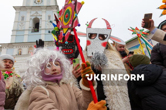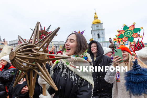 Учасники у традиційних святкових костюмах позують для фото з різдвяними зірками на Михайлівській площі біля Михайлівського Золотоверхого монастиря перед початком Різдвяної ходи з зірками центром столиці, організованої з метою продовження давніх українських традицій, підтримки одне одного в умовах війни та вшанування пам’яті полеглих українських захисників, Київ, 25 грудня 2025 року.