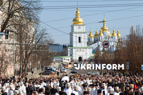 Священнослужитель несе патріарший кукіль під час жалобної процесії з тілом почесного патріарха Київського і всієї Руси-України, ієрарха на спокої Православної церкви України Філарета (у миру Михайла Денисенка) від Михайлівського золотоверхого монастиря через Софійську площу до Володимирського кафедрального собору, у якому представники духовенства довершать відспівування та проведуть поховання, Київ, 22 березня 2026 року. Почесний патріарх Філарет помер 20 березня у віці 97 років.