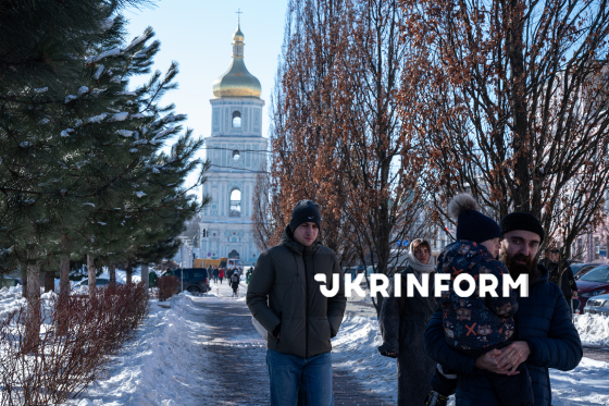 Кияни йдуть вулицею міста у сонячний зимовий день, Київ, 21 лютого 2026 року.