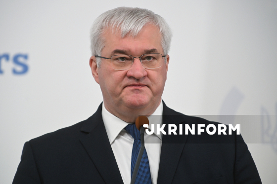 Міністр закордонних справ України Андрій Сибіга бере участь у спільній з міністеркою закордонних справ, торгівлі та оборони Ірландії Гелен Макенті пресконференції, у межах якої ірландська дипломатка оголосила про виділення Україні додаткових 40,3 млн євро на гуманітарну і стабілізаційну підтримку, Київ, 1 квітня 2026 року.