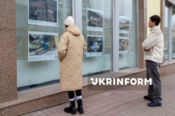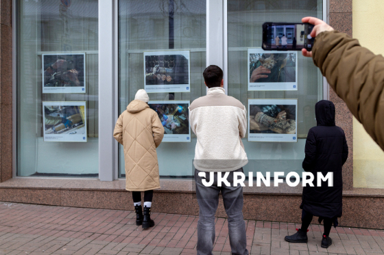 Люди роздивляються світлини, представлені в межах виставки "Долоні сили, що тримають світ" фотокореспондента Укрінформу, бойового медика ЗСУ Олени Худякової (позивний "Мауглі"), у вікнах Українського національного інформаційного агентства "Укрінформ", 28 листопада 2025 року.