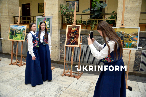 Дівчата позують для фото під час благодійної виставки-продажу робіт місцевих художників в атріумі головної адміністративної будівлі області, Ужгород, 19 березня 2026 року. До виставки долучилися 18 митців, серед яких - народні художники України Борис Кузьма та Василь Свалявчик, а також заслужені художники України Василь Вовчок, Іван Дідик, Людмила Корж-Радько, Володимир Павлишин, Наталія Сіма-Павлишин, Антон Ковач, Олена Кондратюк. Половину коштів, виручених від продажу картин, спрямують на підтримку Збройних сил України.