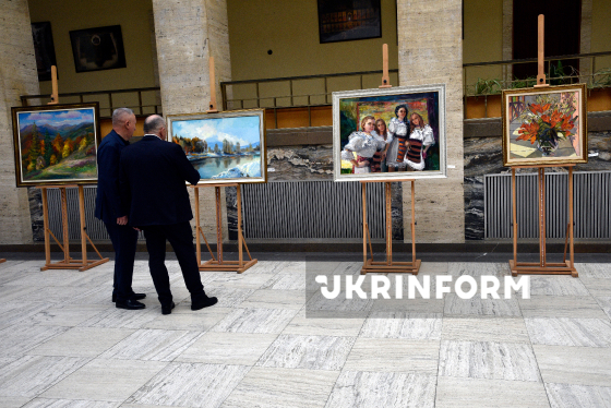 Відвідувачі роздивляються картини, представлені в межах благодійної виставки-продажу робіт місцевих художників, в атріумі головної адміністративної будівлі області, Ужгород, 19 березня 2026 року. До виставки долучилися 18 митців, серед яких - народні художники України Борис Кузьма та Василь Свалявчик, а також заслужені художники України Василь Вовчок, Іван Дідик, Людмила Корж-Радько, Володимир Павлишин, Наталія Сіма-Павлишин, Антон Ковач, Олена Кондратюк. Половину коштів, виручених від продажу картин, спрямують на підтримку Збройних сил України.