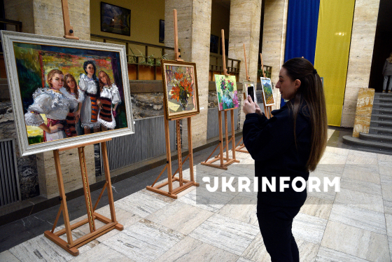 Дівчата роблять селфі в межах благодійної виставки-продажу робіт місцевих художників в атріумі головної адміністративної будівлі області, Ужгород, 19 березня 2026 року. До виставки долучилися 18 митців, серед яких - народні художники України Борис Кузьма та Василь Свалявчик, а також заслужені художники України Василь Вовчок, Іван Дідик, Людмила Корж-Радько, Володимир Павлишин, Наталія Сіма-Павлишин, Антон Ковач, Олена Кондратюк. Половину коштів, виручених від продажу картин, спрямують на підтримку Збройних сил України.