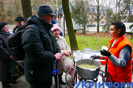 Волонтерка наливає порції рибної юшки літнім людям у черзі, Ужгород, 30 грудня 2024 року.
