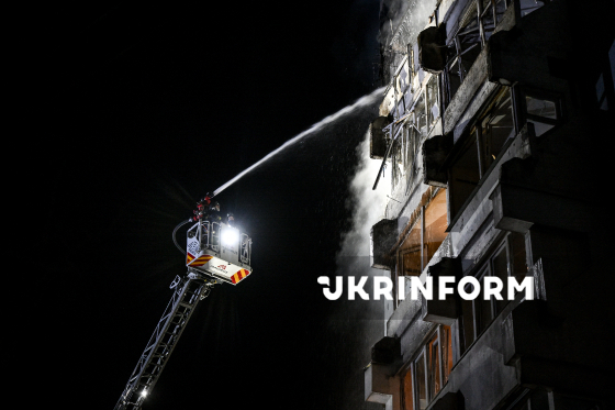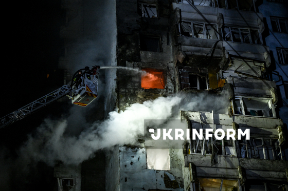 Рятувальники гасять пожежу в одній із квартир багатоповерхового житлового будинку, в яку влучив російський БпЛА, Запоріжжя, 24 березня 2026 року. Вночі російські війська атакували місто ударними дронами та балістичними ракетами. Внаслідок обстрілу одна людина загинула, ще дев`ятеро дістали поранення.