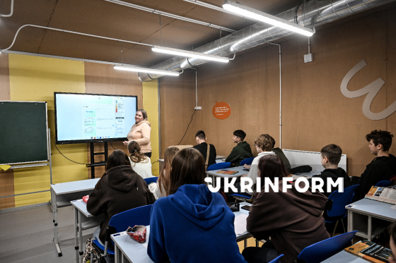 Вчителька веде урок у навчальному приміщенні нової "підземної" школи, що відкрилася на базі загальноосвітньої школи № 87 у Дніпровському районі Запоріжжя, 15 січня 2026 року. Це вже 18-й безпечний освітній простір у Запорізькій області. Навчальний заклад створений у межах державної програми будівництва протирадіаційних укриттів і дозволяє організувати очне навчання в умовах безпеки. Загальна площа підземної школи становить понад 1300 квадратних метрів, а навчатися тут зможуть майже 1000 дітей у дві зміни - учні школи № 87 та сусідньої гімназії №26. У підземній школі облаштовані просторі навчальні класи з сучасними меблями, мультимедійним обладнанням, телевізорами та гаджетами. Окрім навчальних приміщень, тут передбачені буфет, медичний пункт, санітарні кімнати, лаунж-зона та спортивний куточок.