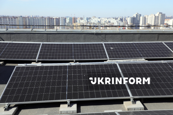Сонячна електростанція (СЕС), встановлена за програмою "СвітлоДІМ" на даху житлової багатоповерхівки на вулиці Соломії Крушельницької, 15В, Київ, 12 березня 2026 року. Журналісти відвідали виїзний захід у межах державної програми "СвітлоДІМ, під час якого було показано, як працює підтримка автономного енергоживлення багатоквартирних будинків на прикладі двох ОСББ у Дарницькому районі міста.