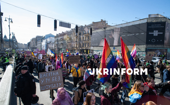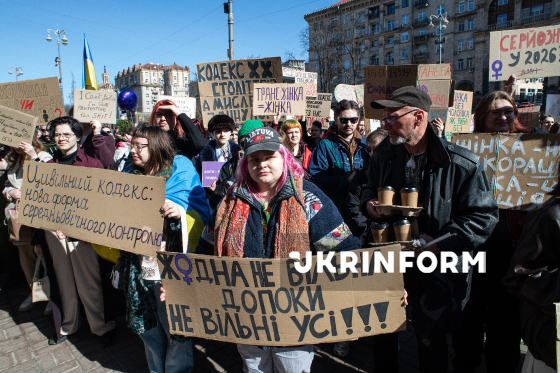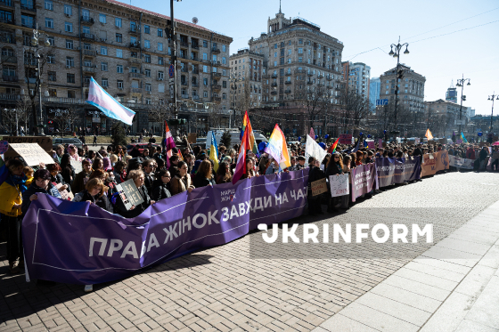 Учасники Маршу жінок, присвяченого боротьбі з ґендерною дискримінацією та захисту прав жінок, з метою зосередити увагу на правах жінок-військових, необхідності боротьби з сексуальними домаганнями та дискримінацією у Збройних силах України, а також на підтримці жінок, які перебувають у російському полоні, йдуть Хрещатиком, Київ, 8 березня 2026 року.