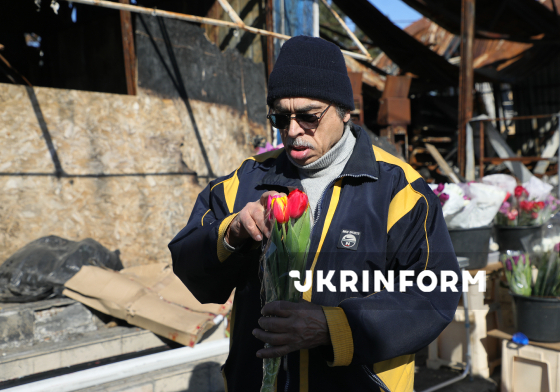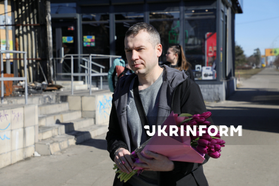 Чоловік з букетом тюльпанів йде вулицею, Київ, 8 березня 2026 року.