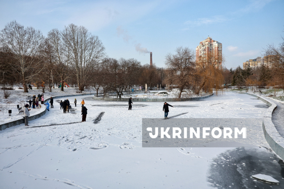 Люди гуляють на кризі замерзлого ставка у Парку перемоги, Одеса, 15 січня 2026 року.