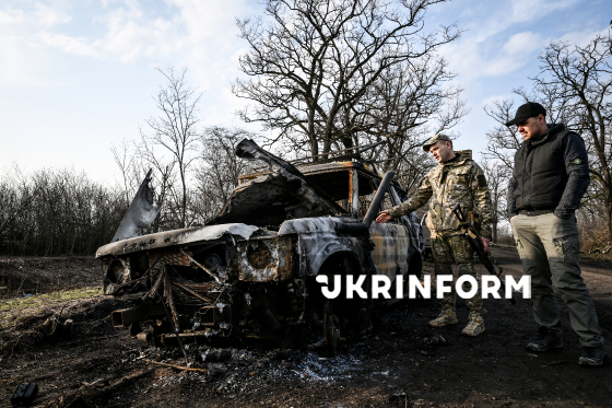 Бійці 141 окремої механізованої бригади на позивні “Депутат” і “Кажан” оглядають згорілий внаслідок влучання російського FPV-дрона автомобіль на узбіччі прифронтової дороги, 19 березня 2026 року.