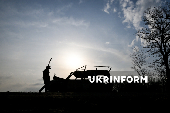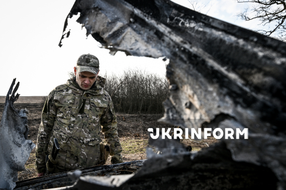 Боєць 141 окремої механізованої бригади на позивний “Кажан” оглядає згорілий внаслідок влучання російського FPV-дрона автомобіль на узбіччі прифронтової дороги, 19 березня 2026 року.
