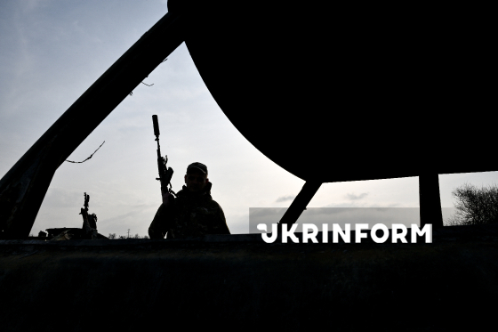 Боєць 141 окремої механізованої бригади на позивний “Кажан” з автоматом у руках стоїть біля згорілого внаслідок влучання російського FPV-дрона автомобіля на узбіччі прифронтової дороги, 19 березня 2026 року.