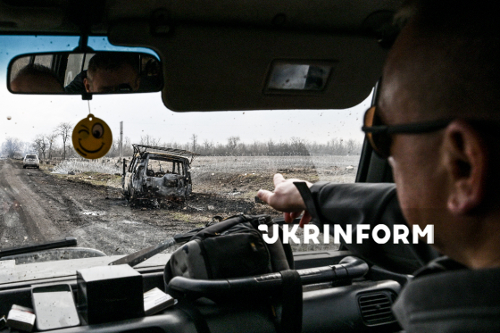 Боєць 141 окремої механізованої бригади показує згорілий внаслідок влучання російського FPV-дрона автомобіль на узбіччі прифронтової дороги, 19 березня 2026 року.