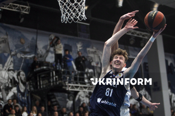 Гравець БК "Харківські Соколи" Максим Безима бере участь у матчі чемпіонату України з баскетболу серед команд Суперліги проти БК "Дніпро", що завершився перемогою господарів з рахунком 98:58, у залі СК "Шинник", Дніпро, 28 лютого 2026 року. Гру розпочали ще 1 лютого, але через повітряну тривогу матч було зупинено за 7:47 до кінця другої чверті за рахунку 35:11 на користь дніпрян.