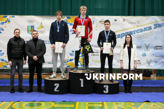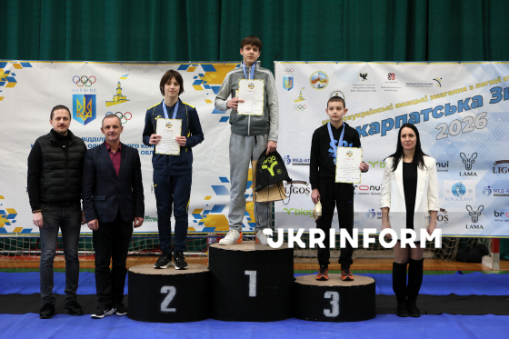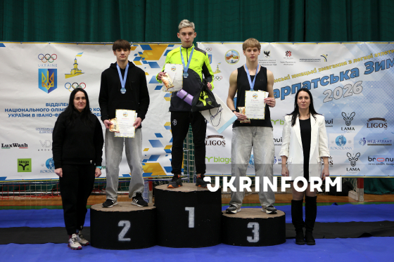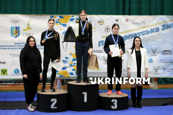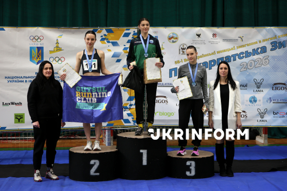 Призери Всеукраїнських змагань у приміщенні "Прикарпатська зима -2026" серед юнаків та дівчат 2009-2010 рр.н. та молодших, присвячених пам’яті колишнього директора обласної дитячо-юнацької спортивної школи Михайла Дебенка, позують для фото у легкоатлетичному манежі ВСП "Івано-Франківського фахового коледжу фізичного виховання НУФВС України", Івано-Франківськ, 25 лютого 2026 року.