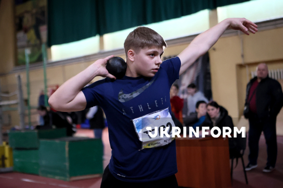 Учасник Всеукраїнських змагань у приміщенні "Прикарпатська зима -2026" серед юнаків та дівчат 2009-2010 рр.н. та молодших, присвячених пам’яті колишнього директора обласної дитячо-юнацької спортивної школи Михайла Дебенка, штовхає ядро у легкоатлетичному манежі ВСП "Івано-Франківського фахового коледжу фізичного виховання НУФВС України", Івано-Франківськ, 25 лютого 2026 року.