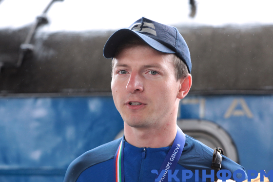 Чемпіон Європи в особистій першості з фехтування на шпагах, український шпажист Роман Свічкар під час зустрічі після повернення з ЧЄ-2025 з фехтування на Центральному залізничному вокзалі, Київ, 21 червня 2025 року.