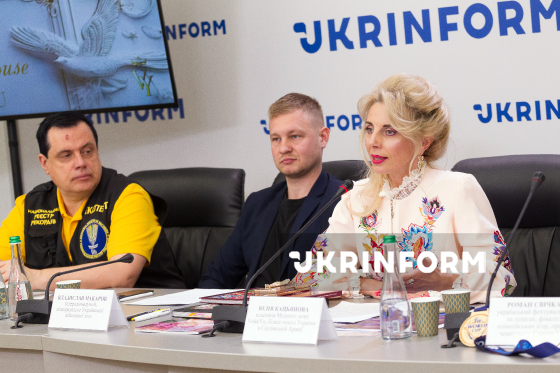 Експерт Національного реєстру рекордів України Віталій Зорін, телерадіоведучий, віцепрезидент Української військової ліги Владислав Макаров та власниця Модного дому VoleeYu, бізнес-посол України в Саудівській Аравії Юлія Кацьянова (зліва направо) беруть участь у пресконференції на тему: "Авторське право в мистецтві. Популяризація культурного надбання у світі" в Українському національному інформаційному агентстві "Укрінформ", Київ, 3 квітня 2026 року.