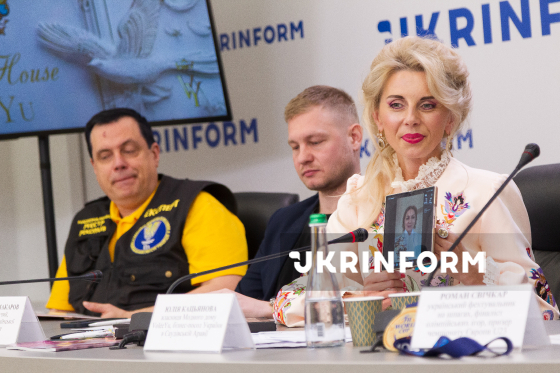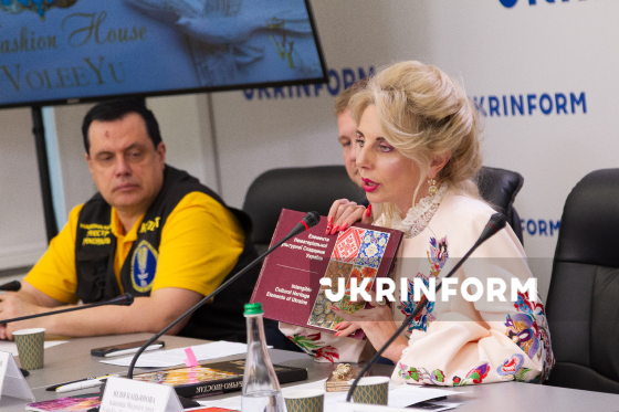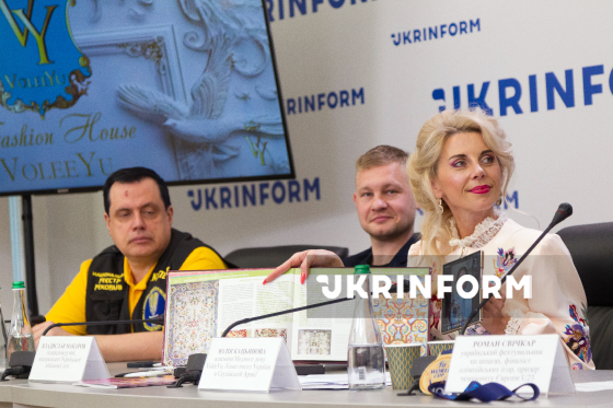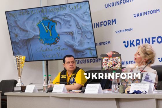 Експерт Національного реєстру рекордів України Віталій Зорін та власниця Модного дому VoleeYu, бізнес-посол України в Саудівській Аравії Юлія Кацьянова беруть участь у пресконференції на тему: "Авторське право в мистецтві. Популяризація культурного надбання у світі" в Українському національному інформаційному агентстві "Укрінформ", Київ, 3 квітня 2026 року.