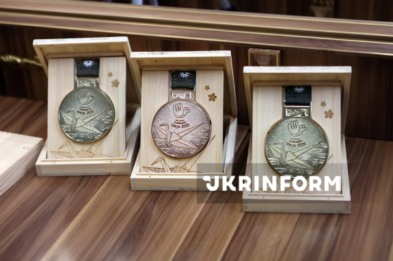Медалі XXV літніх Дефлімпійських ігор у Токіо, здобуті українськими спортсменами, демонструються під час зустрічі голови Івано-Франківської ОВА Світлани Онищук із прикарпатськими спортсменами, які успішно представили Україну на міжнародних спортивних аренах, Івано-Франківськ, 2 грудня 2025 року.