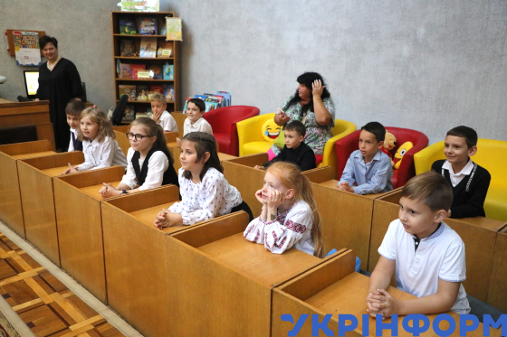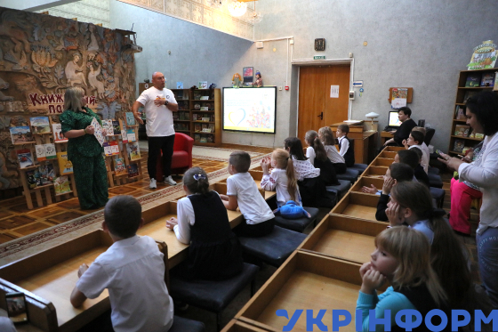 Діти беруть участь в "Олімпійському уроці", який у Національній бібліотеці України для дітей проводить срібний призер Олімпійських ігор з вільної боротьби Валерій Андрійцев, під час святкового заходу під гаслом "Крок до Олімпу", організованого у межах Всеукраїнської акції Національного олімпійського комітету України "Олімпійський куточок" до Дня фізичної культури і спорту, на якому близько двохсот дітей віком від 10 до 13 років мали можливість зустрітися і поспілкуватися з українськими спортсменами, Київ, 11 вересня 2025 року.