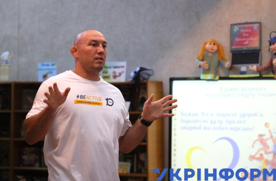 Срібний призер Олімпійських ігор з вільної боротьби Валерій Андрійцев проводить у Національній бібліотеці України для дітей "Олімпійський урок" під час святкового заходу під гаслом "Крок до Олімпу", організованого у межах Всеукраїнської акції Національного олімпійського комітету України "Олімпійський куточок" до Дня фізичної культури і спорту, на якому близько двохсот дітей віком від 10 до 13 років мали можливість зустрітися і поспілкуватися з українськими спортсменами, Київ, 11 вересня 2025 року.