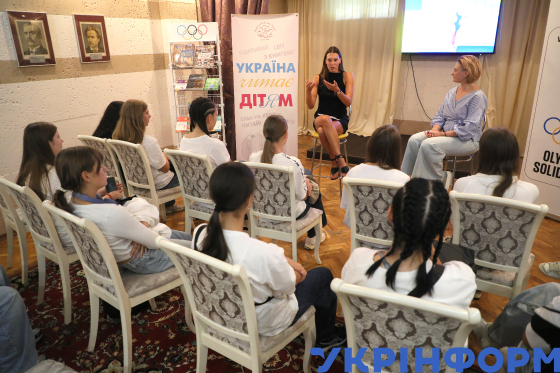 Колишня українська плавчиня-синхроністка, дворазова бронзова призерка Олімпійських ігор з синхронного плавання Марта Фєдіна (праворуч) проводить у Національній бібліотеці України для дітей "Олімпійський урок" під час святкового заходу під гаслом "Крок до Олімпу", організованого у межах Всеукраїнської акції Національного олімпійського комітету України "Олімпійський куточок" до Дня фізичної культури і спорту, на якому близько двохсот дітей віком від 10 до 13 років мали можливість зустрітися і поспілкуватися з українськими спортсменами, Київ, 11 вересня 2025 року.