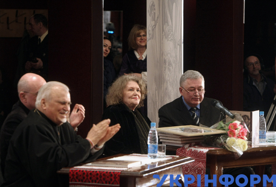 Народний артист України, диктор Національної радіокомпанії України, протоієрей УПЦ Петро Бойко (ліворуч), літературознавець, письменник Володимир Панченко (праворуч) на презентації книги "Берестечко" видатної української поетеси Ліни Костенко (друга праворуч) у Національному центрі ділового і культурного співробітництва "Український дім", Київ, 22 березня 2010 року. Фото Вадима Григи.
