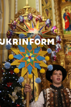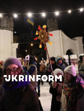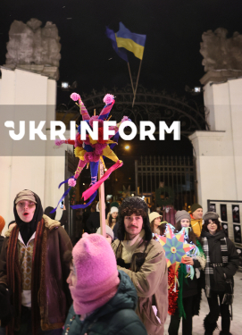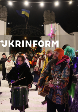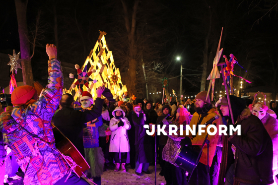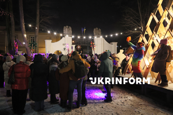 Колядники колядують на території різдяного містечка на Контрактовій площі, Київ, 31 грудня 2025 року.