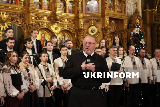 Настоятець парафії Христа Царя, ігумен монастиря отців Василіян на Майзлях отець Корнилій Яремак виголошує промову під час гала-концерту XVII Міжнародного різдвяного фестивалю “Коляда на Майзлях” у храмі Царя Христа, Івано-Франківськ, 28 грудня 2025 року.