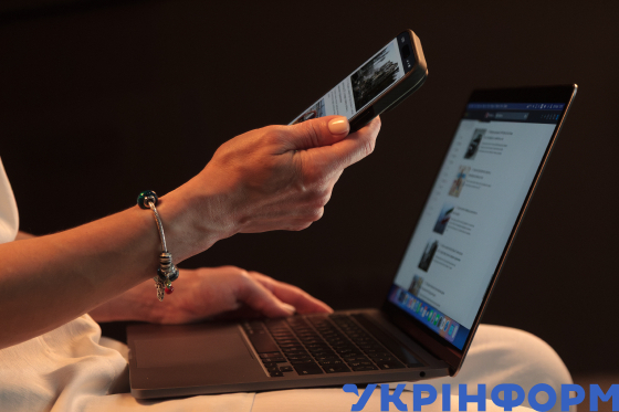 Жінка тримає смартфон у руці під час роботи на ноутбуці, Київ, 6 серпня 2025 року.