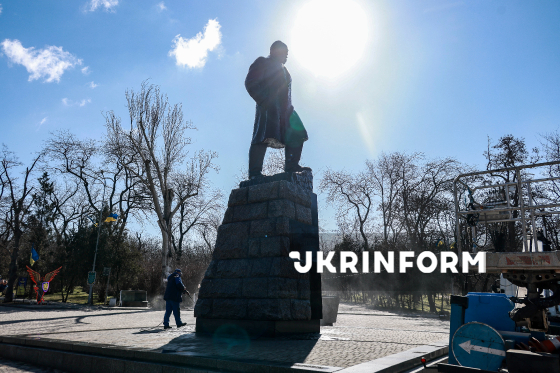 Фахівці комунального підприємства “Сервісний центр” миють пам`ятник Тарасові Шевченку напередодні 212-ї річниці від його дня народження, Одеса, 6 березня 2026 року.