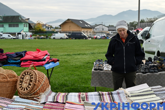 Жінка продає плетені корзини та ткані рушники на місцевому ринку, смт Верховина, Івано-Франківська область, 5 жовтня 2023 року.