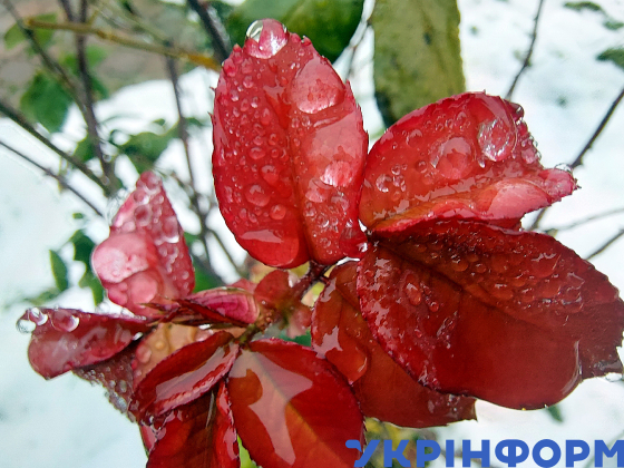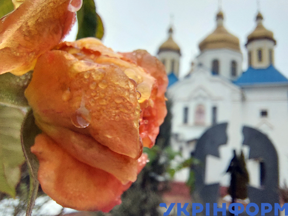 Краплі дощу на троянді неподалік від храму Вознесіння Господнього УПЦ, Вишневе, Київська область, 30 листопада 2024 року.