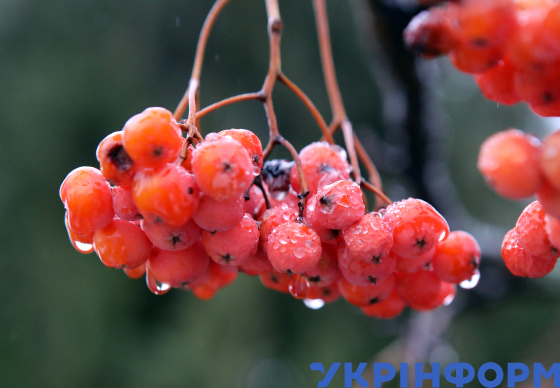Краплі дощу на гроні горобини, Вишневе, Київська область, 30 листопада 2024 року.