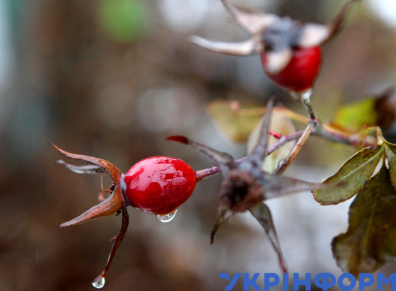 Краплі дощу на плодах шипшини, Вишневе, Київська область, 30 листопада 2024 року.