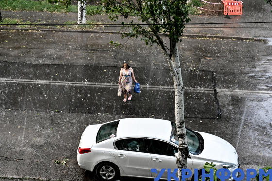 Жінка йде вулицею під час сильної зливи, Запоріжжя, 7 липня 2023 року.