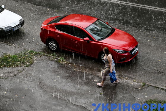 Жінка переходить дорогу під час сильної зливи, Запоріжжя, 7 липня 2023 року.