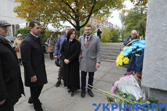 Представник Крайової ради українців Криму Андрій Іванець, заступник міністра закордонних справ України Олександр Міщенко, постійна Представниця Президента України в Автономній Республіці Крим Ольга Куришко та голова Українського інституту національної пам’яті Олександр Алфьоров (зліва направо) беруть участь у вшанування пам’яті військового діяча доби Української революції 1917-1921 років та командувача однієї з найуспішніших операцій Армії УНР — полковника Петра Болбочана, біля пам`ятника на вулиці Січових Стрільців, 86, Київ, 17 жовтня 2025 року.