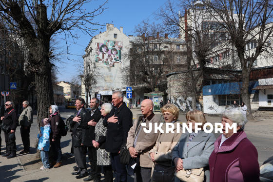 Учасники виконують державний гімн України на поминальному віче, присвяченому 27-им роковинам загибелі українського національного лідера, голови Народного Руху України В`ячеслава Чорновола, біля пам`ятника політику, Івано-Франківськ, 25 березня 2026 року.