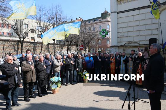 Народний артист України Михайло Кривень співає на поминальному віче, присвяченому 27-им роковинам загибелі українського національного лідера, голови Народного Руху України В`ячеслава Чорновола, біля пам`ятника політику, Івано-Франківськ, 25 березня 2026 року.