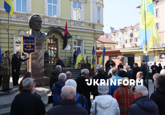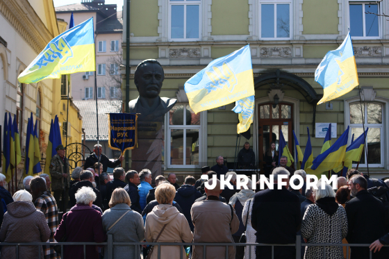 Учасники поминального віче, присвяченого 27-им роковинам загибелі українського національного лідера, голови Народного Руху України В`ячеслава Чорновола, вшановують пам`ять біля пам`ятника політику, Івано-Франківськ, 25 березня 2026 року.