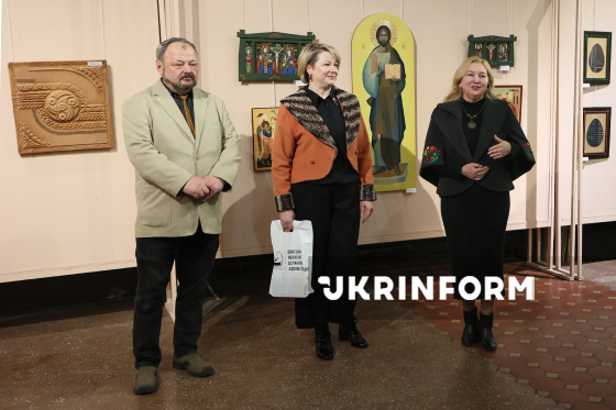 Директор музею Василь Романець та заступниця начальника управління культури і релігій Івано-Франківської ОВА Мирослава Корнелюк (праворуч) беруть участь у відкритті виставки дипломних та курсових робіт студентів Косівського державного інституту декоративного мистецтва в музеї мистецтв Прикарпаття, Івано-Франківськ, 24 березня 2026 року.