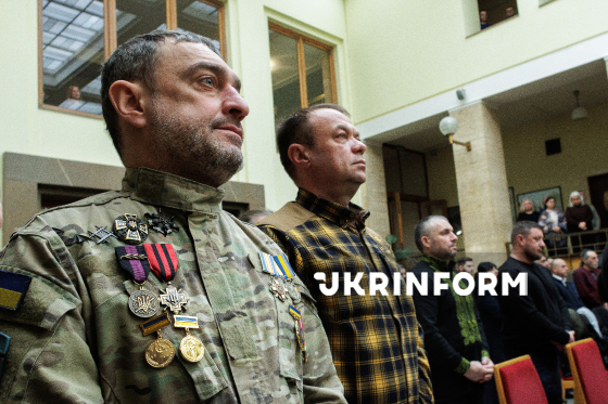 Військовослужбовець бере участь в екуменічній молитві, приуроченій до Національного дня молитви, у день четвертих роковин повномасштабного вторгнення Росії в Україну, Ужгород, 24 лютого 2026 року. Фото надано групою комунікацій Закарпатського ОТЦК та СП.