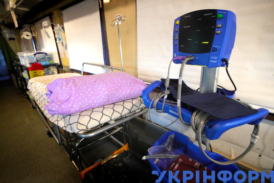 Апарат штучної вентиляції легень, шприцевий інфузійний насос біля ліжка у вагоні інтенсивної терапії потяга-госпіталя для поранених, травмованих, хворих людей з "гарячих" областей України, Київ, 14 червня 2022 року.