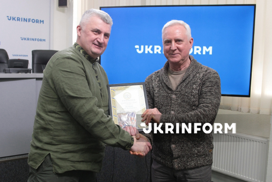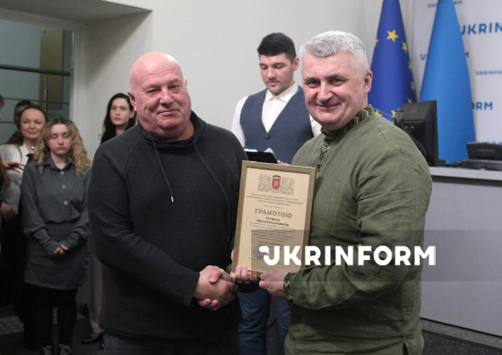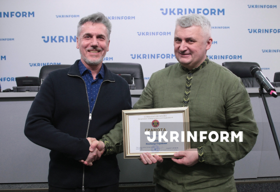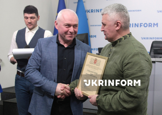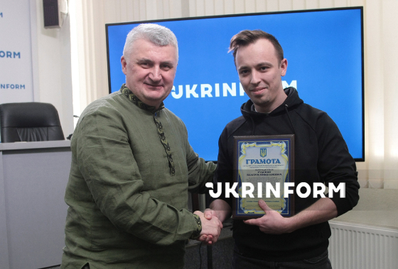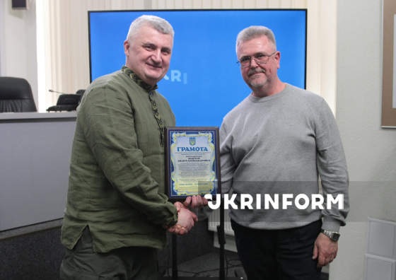 Генеральний директор Укрінформу Сергій Череватий (ліворуч) вручає грамоту Національного університету Цивільного захисту України заступнику начальника управління - начальнику відділу по роботі з персоналом Сергію Анфіногенову під час урочистого заходу з нагоди 108-ї річниці від дня заснування Українського національного інформаційного агентства “Укрінформ”, Київ, 16 березня 2026 року.