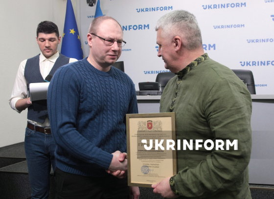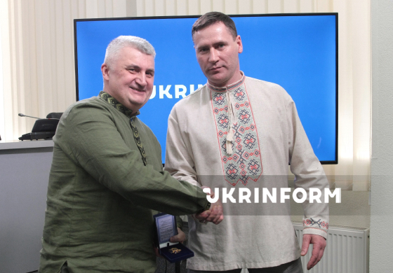 Генеральний директор Укрінформу Сергій Череватий (ліворуч) вручає відзнаку СБУ Юрію Василенку під час урочистого заходу з нагоди 108-ї річниці від дня заснування Українського національного інформаційного агентства “Укрінформ”, Київ, 16 березня 2026 року.