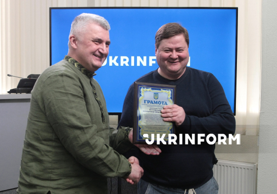 Генеральний директор Укрінформу Сергій Череватий (ліворуч) вручає грамоту Державного Центру захисту інформації та кібербезпеки начальнику відділу корпоративних інформаційних систем Андрію Андреєву під час урочистого заходу з нагоди 108-ї річниці від дня заснування Українського національного інформаційного агентства “Укрінформ”, Київ, 16 березня 2026 року.